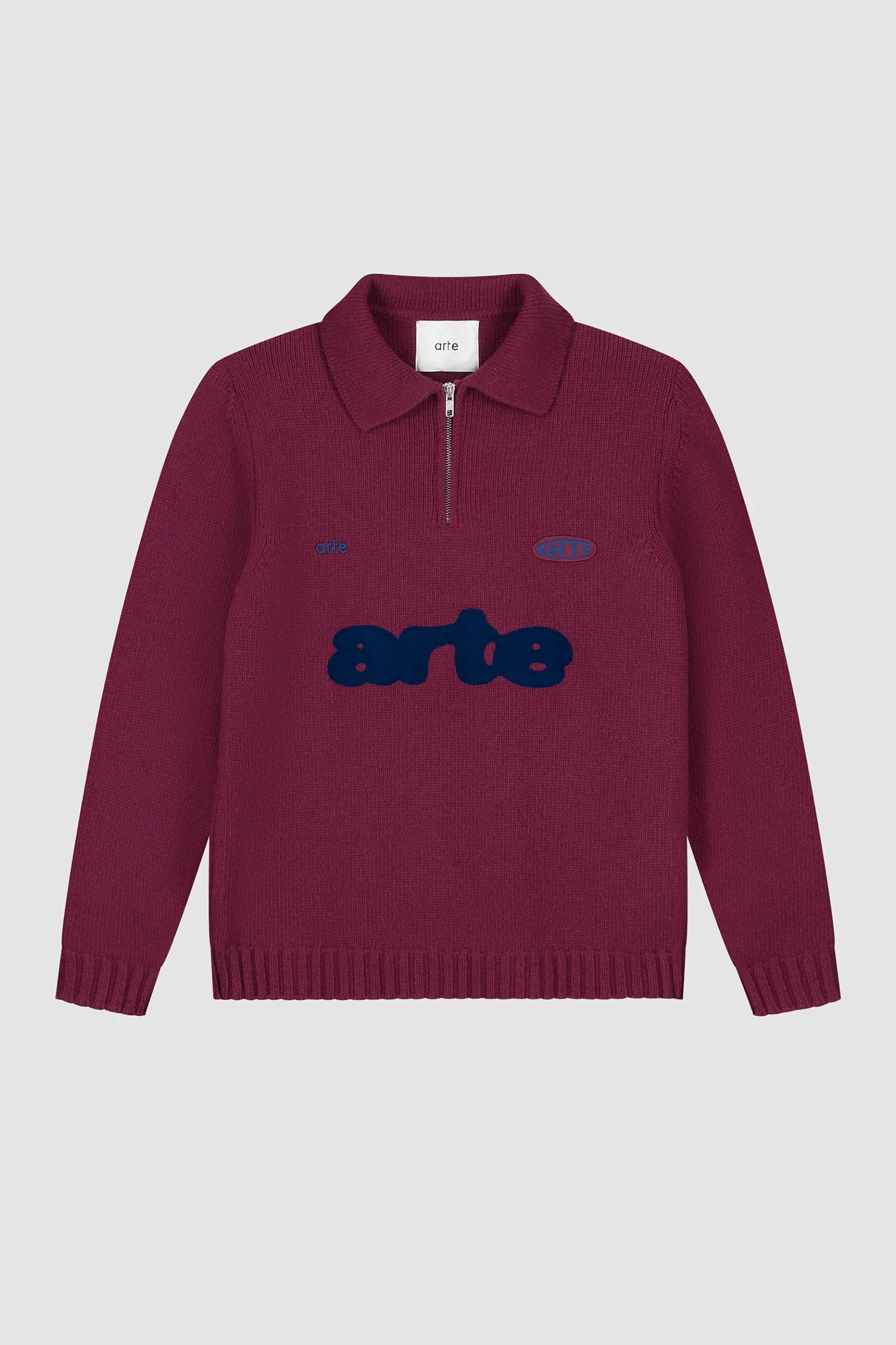La POLO SWEATER di ARTE è un capo perfetto da indossare nei giorni più freddi. Realizzato in misto lana di alta qualità e caratterizzato da una vestibilità comoda con zip a un quarto, questo cardigan lavorato a maglia è disponibile in color bordeaux e può essere indossato in diversi modi. Rifinito con il logo del nostro marchio ricamato in blu navy sul davanti.