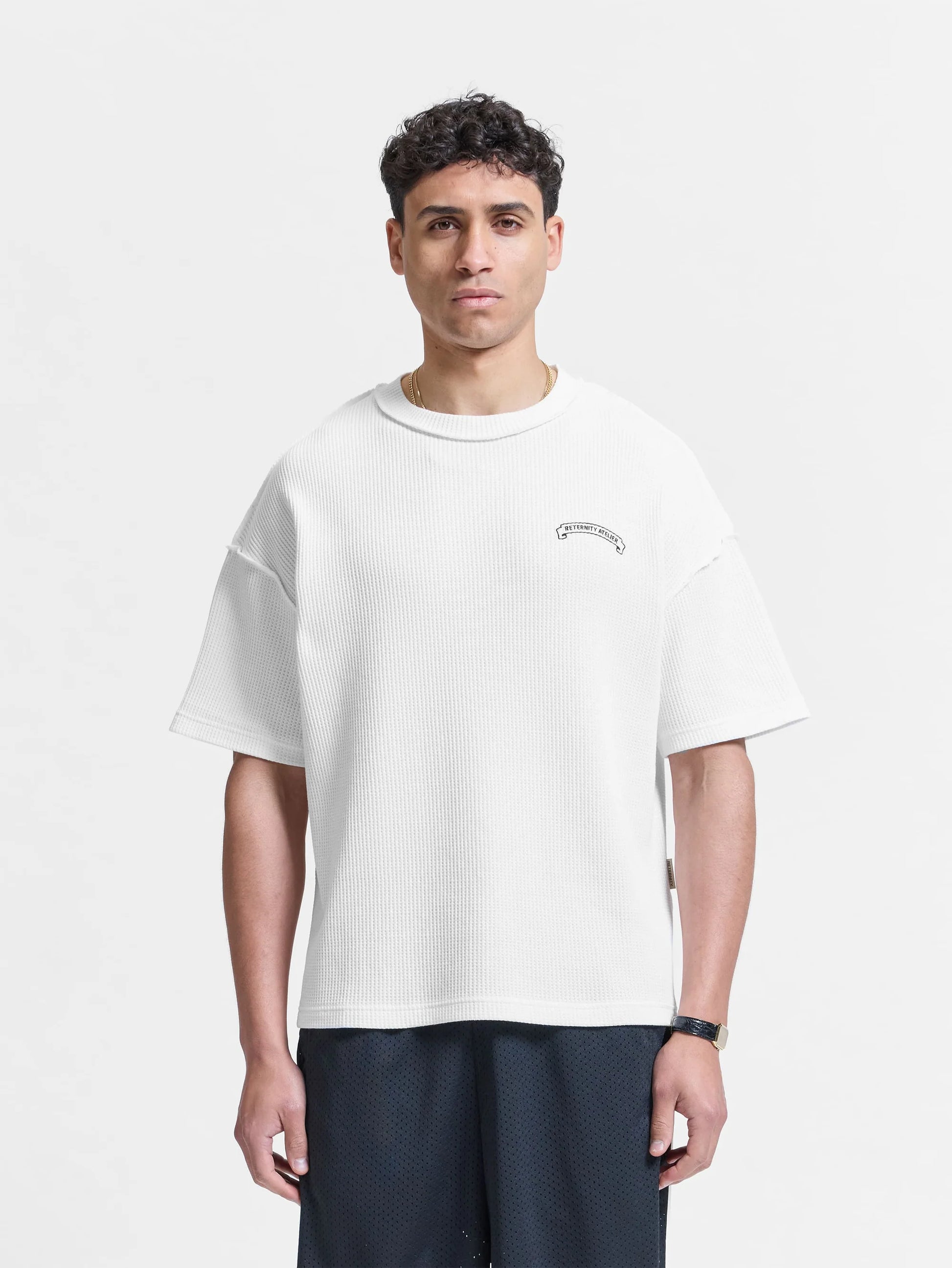 La T-SHIRT BAND OF PROCESS in nero è realizzata in cotone da 250 g/m² con tessuto a nido d'ape, che offre una sensazione unica e un comfort quotidiano. Caratterizzata da cuciture rovesciate e punti overlock a vista, conferisce alla silhouette un look grezzo e strutturato. Rifinita con stampe sul davanti e sul retro e dal taglio squadrato e corto, questo capo coniuga dettagli audaci con proporzioni moderne.
